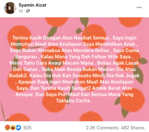 Pada awalnya, ibu muda berkenaan memb1das kembali mereka yang men3gur sikap tidak bertanggungj4wab tersebut sebelum suaminya tampil memohon maaf di Facebook dan berharap agar tidak terus mengec4m mereka kerana sed4r isterinya tidak kuat menerima kec4man daripada warganet.